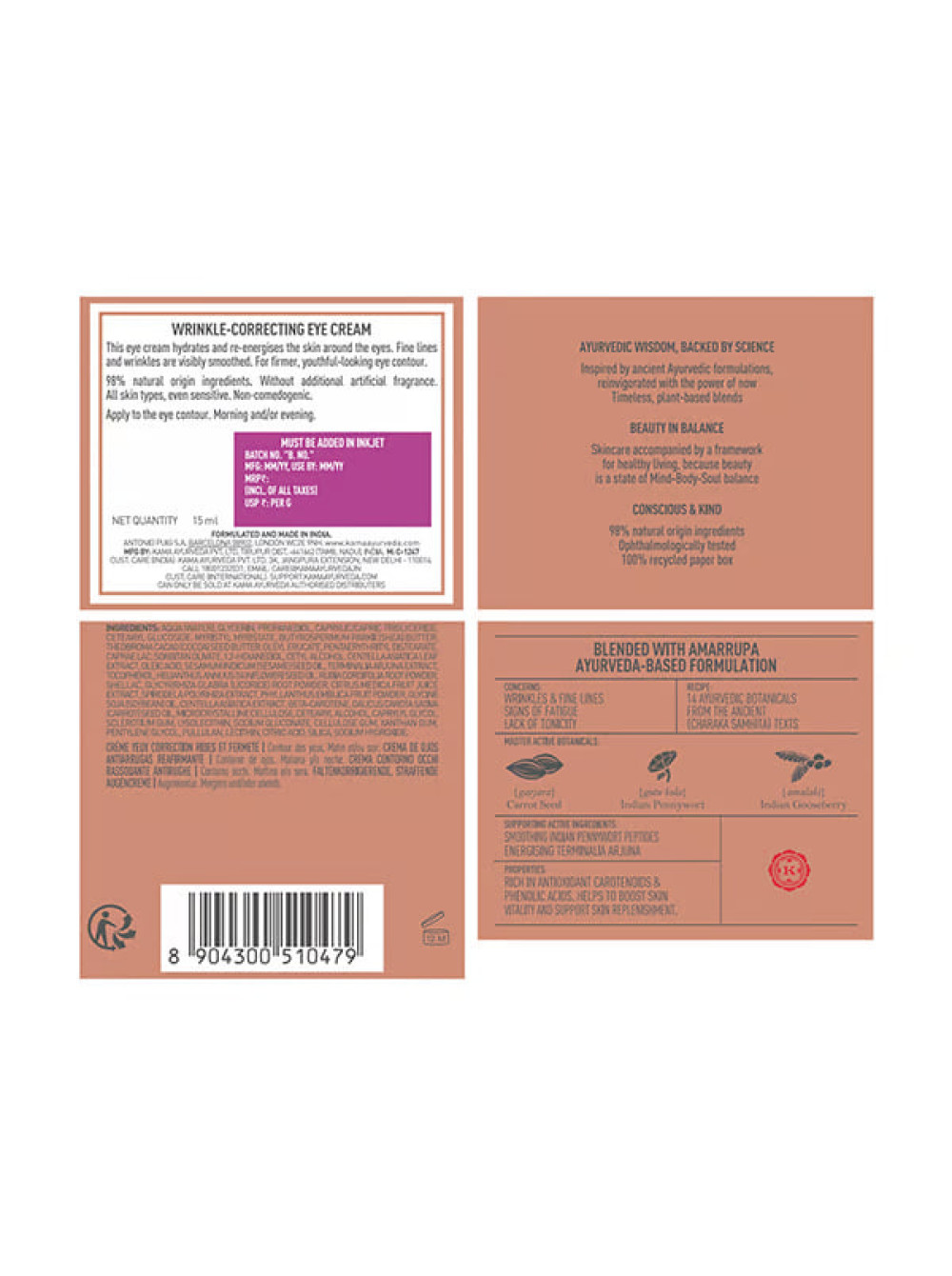 Побалуйте нежную кожу вокруг глаз роскошью нового крема для коррекции морщин Amarrupa от Kama Ayurveda. Эта энергетическая формула, разработанная для борьбы с признаками старения, эффективно разглаживает морщины, уменьшает следы усталости и подтягивает кожу век. Обогащенный мощными аюрведическими ингредиентами, крем Amarrupa нежно ухаживает за кожей, восстанавливая ее упругость и сияние. Клинически доказано, что крем разглаживает и подтягивает кожу вокруг глаз, возвращая ей свежий и молодой вид. Легкая текстура крема быстро впитывается, не оставляя жирного блеска. Формула, обогащенная антиоксидантами, защищает кожу от вредного воздействия свободных радикалов, предотвращая преждевременное старение. С Amarrupa ваша кожа вокруг глаз будет выглядеть более молодой, подтянутой и сияющей. Ощутите преобразование – откройте для себя секрет вечной молодости с Kama Ayurveda. 15 мл упаковки достаточно для длительного использования, обеспечивая ежедневный уход за нежной кожей вокруг глаз.